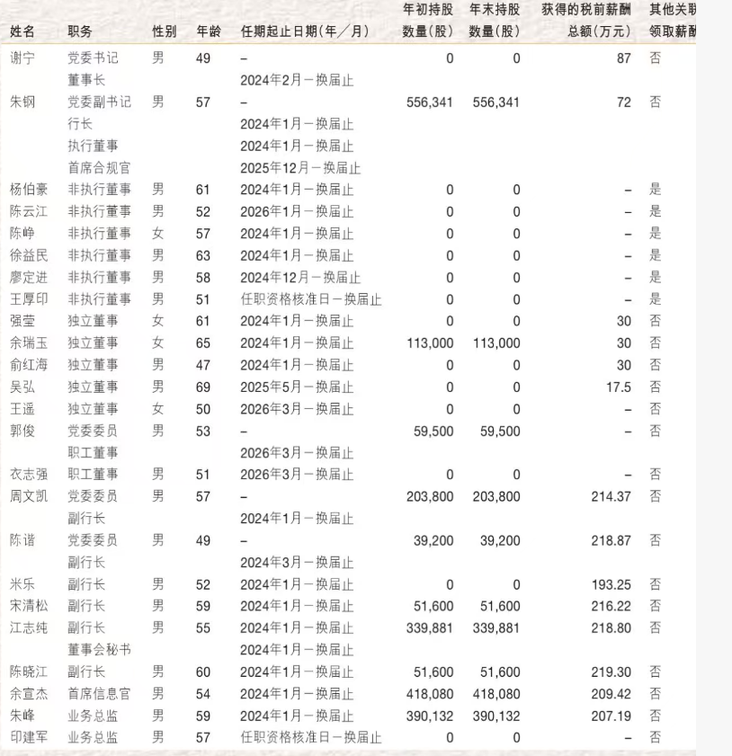 2025年南京银行薪酬最高的为其副行长陈晓江,税前薪酬高达219.3万元,较上一年209.28万元年薪,涨幅为4%。