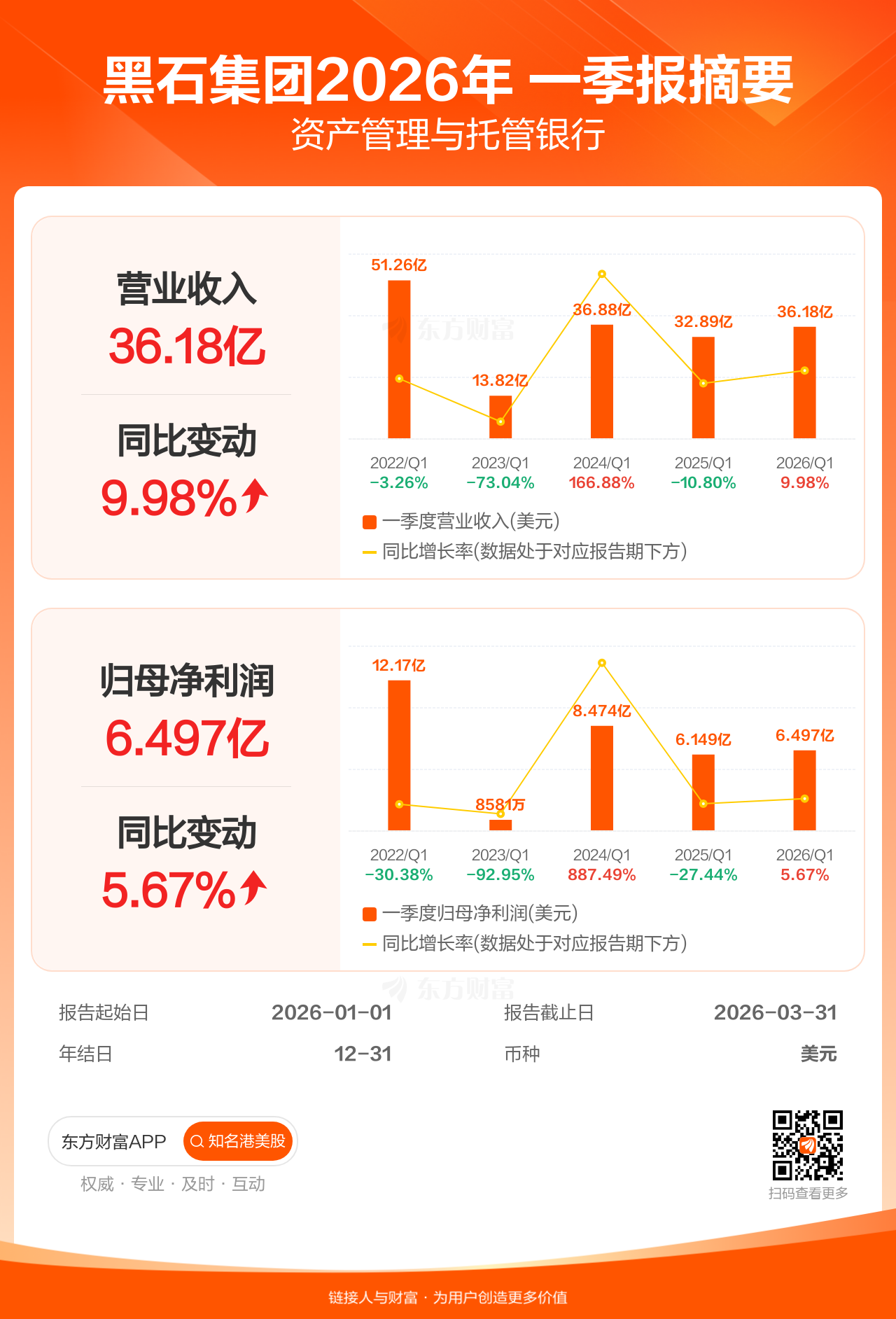 黑石集团4月23日发布一季报业绩,截至2026年3月31日的3个月内,该公司营业收入36.18亿美元,同比增长9.98%;公司权益持有人应占溢利(归母净利润)6.50亿美元,同比增长5.67%。