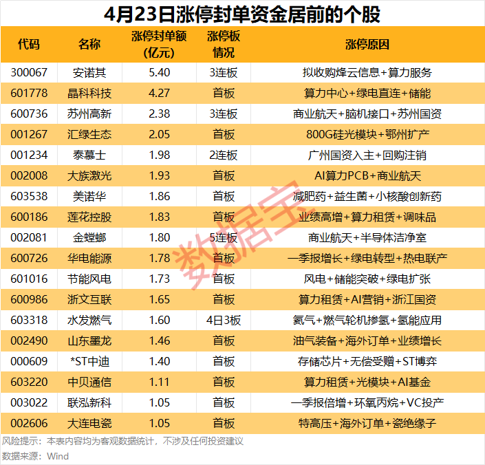 以封单金额计算,安诺其、晶科科技、苏州高新、汇绿生态等涨停板封单资金居前,分别为5.4亿元、4.27亿元、2.38亿元、2.05亿元。