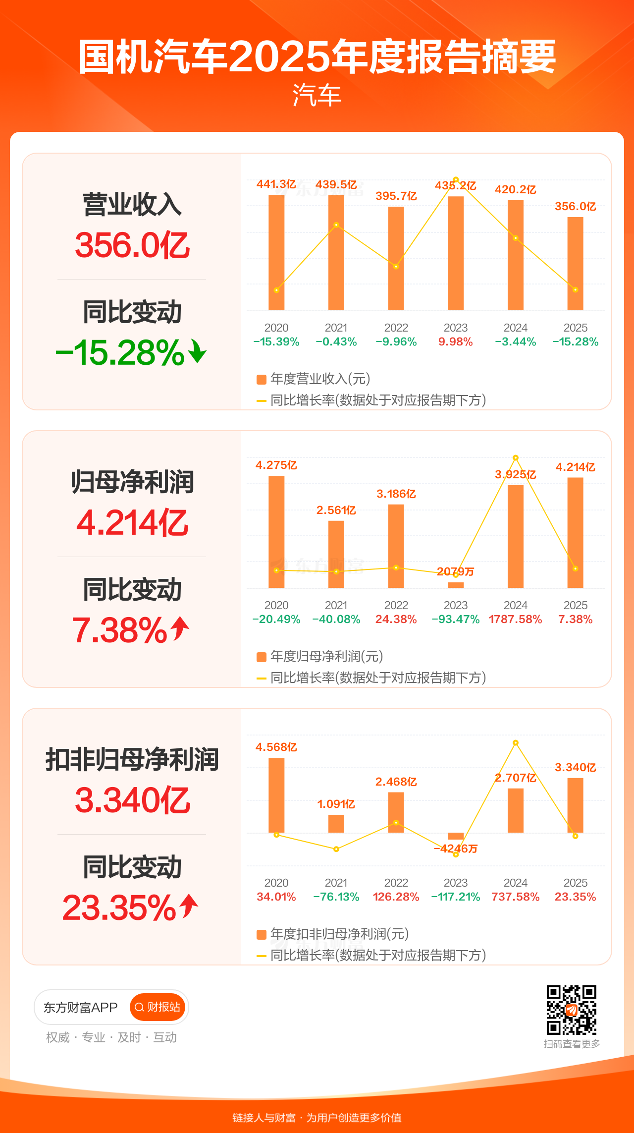国机汽车4月24日发布2025年年报显示,公司全年实现营业收入356.02亿元,同比下滑15.28%;归母净利润4.21亿元,同比增长7.38%;扣非归母净利润3.34亿元,同比增长23.35%。