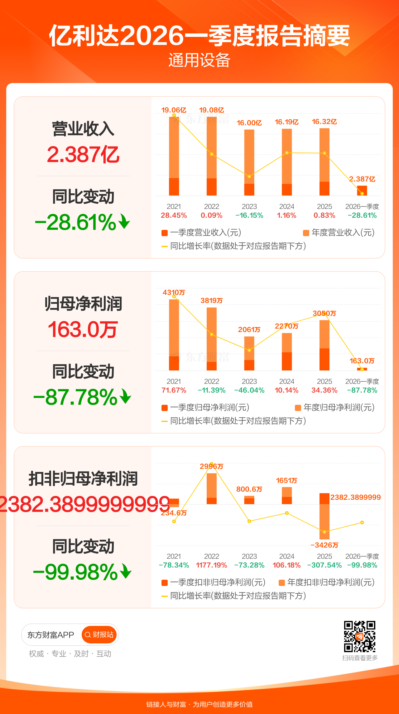 亿利达4月24日发布2026年一季报显示,公司一季度实现营业收入2.39亿元,同比下滑28.61%;归母净利润162.97万元,同比下滑87.78%;扣非归母净利润2382元,同比下滑99.98%。