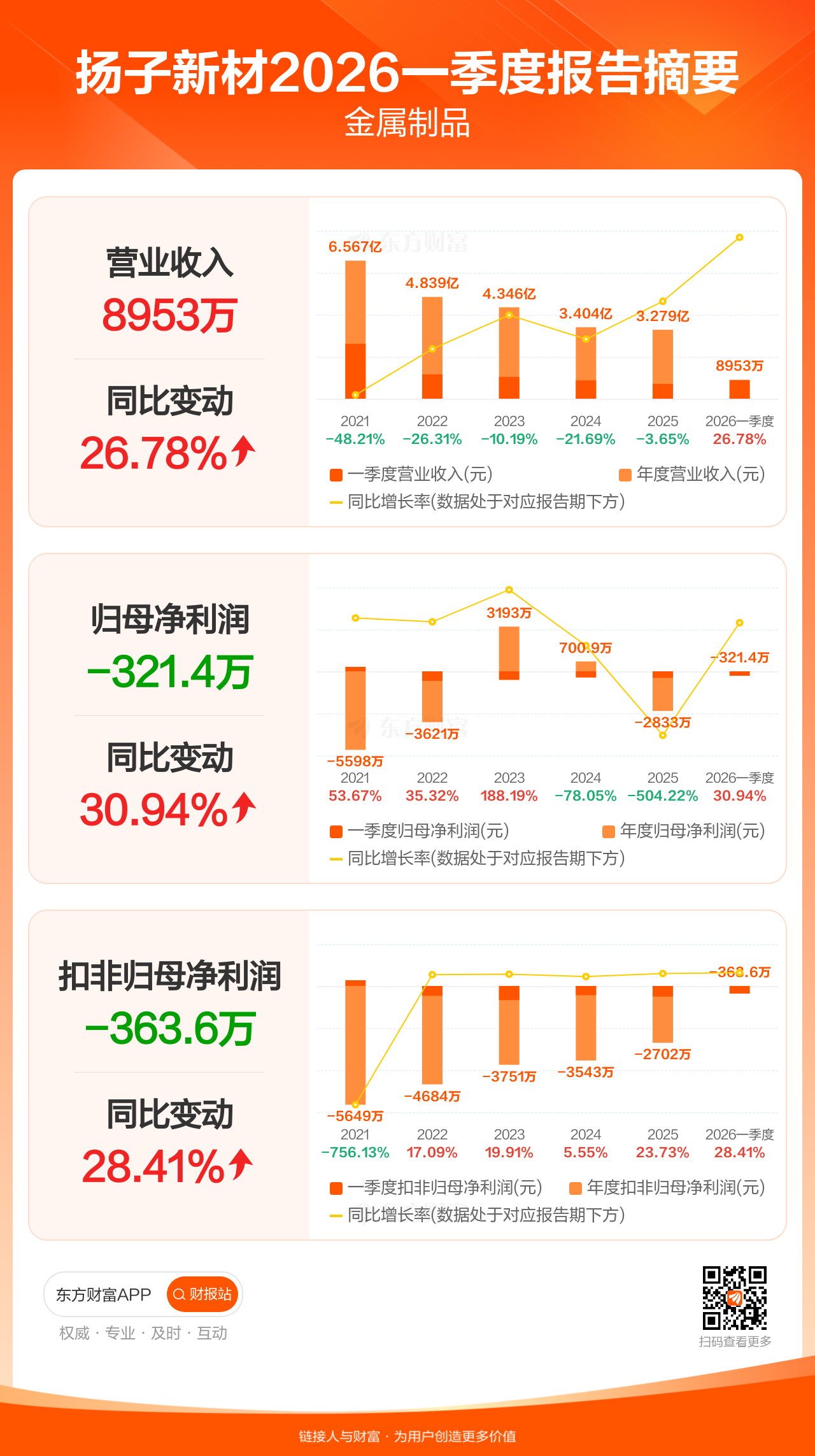 扬子新材4月24日发布2026年一季报显示,公司一季度实现营业收入8953.05万元,同比增长26.78%;归母净利润-321.38万元;扣非归母净利润-363.58万元。