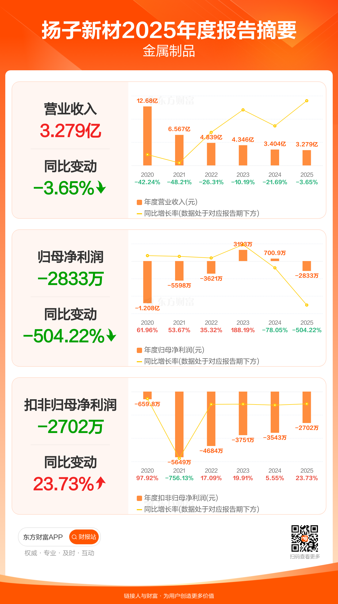 扬子新材4月24日发布2025年年报显示,公司全年实现营业收入3.28亿元,同比下滑3.65%;归母净利润-2833.22万元;扣非归母净利润-2702.11万元。