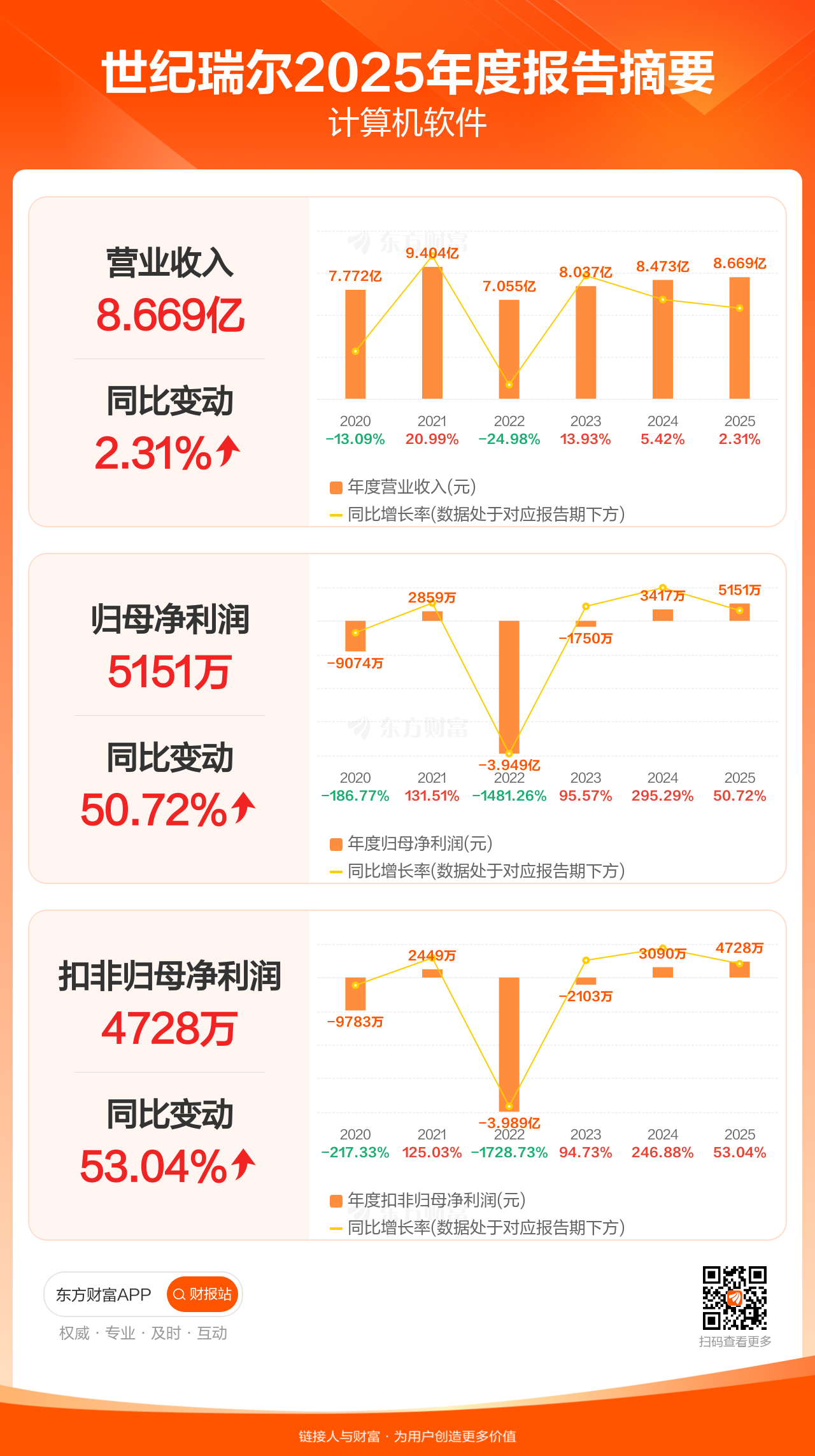 世纪瑞尔4月24日发布2025年年报显示,公司全年实现营业收入8.67亿元,同比增长2.31%;归母净利润5150.65万元,同比增长50.72%;扣非归母净利润4728.20万元,同比增长53.04%。