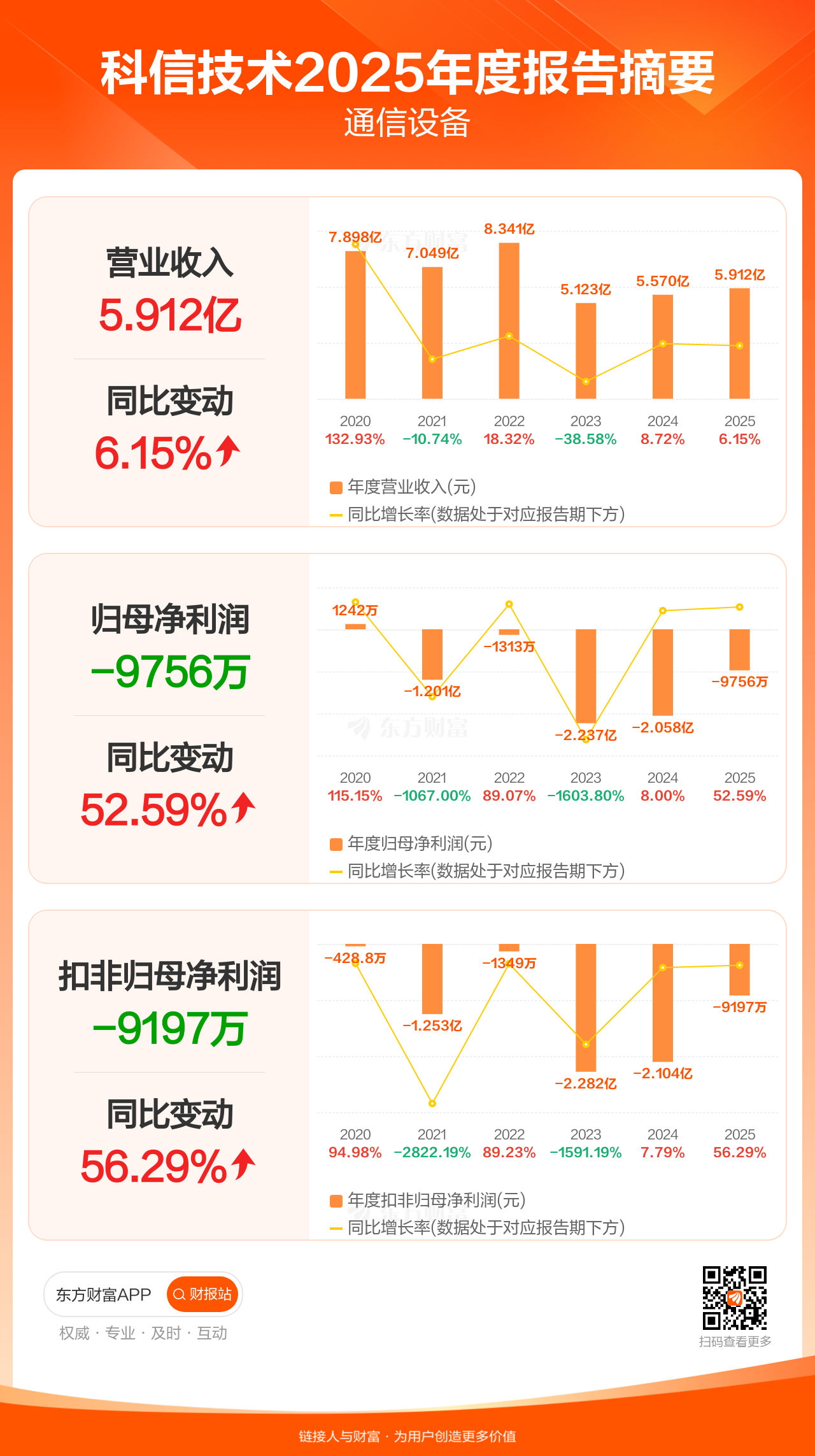 科信技术4月24日发布2025年年报显示,公司全年实现营业收入5.91亿元,同比增长6.15%;归母净利润-9756.41万元;扣非归母净利润-9196.99万元。