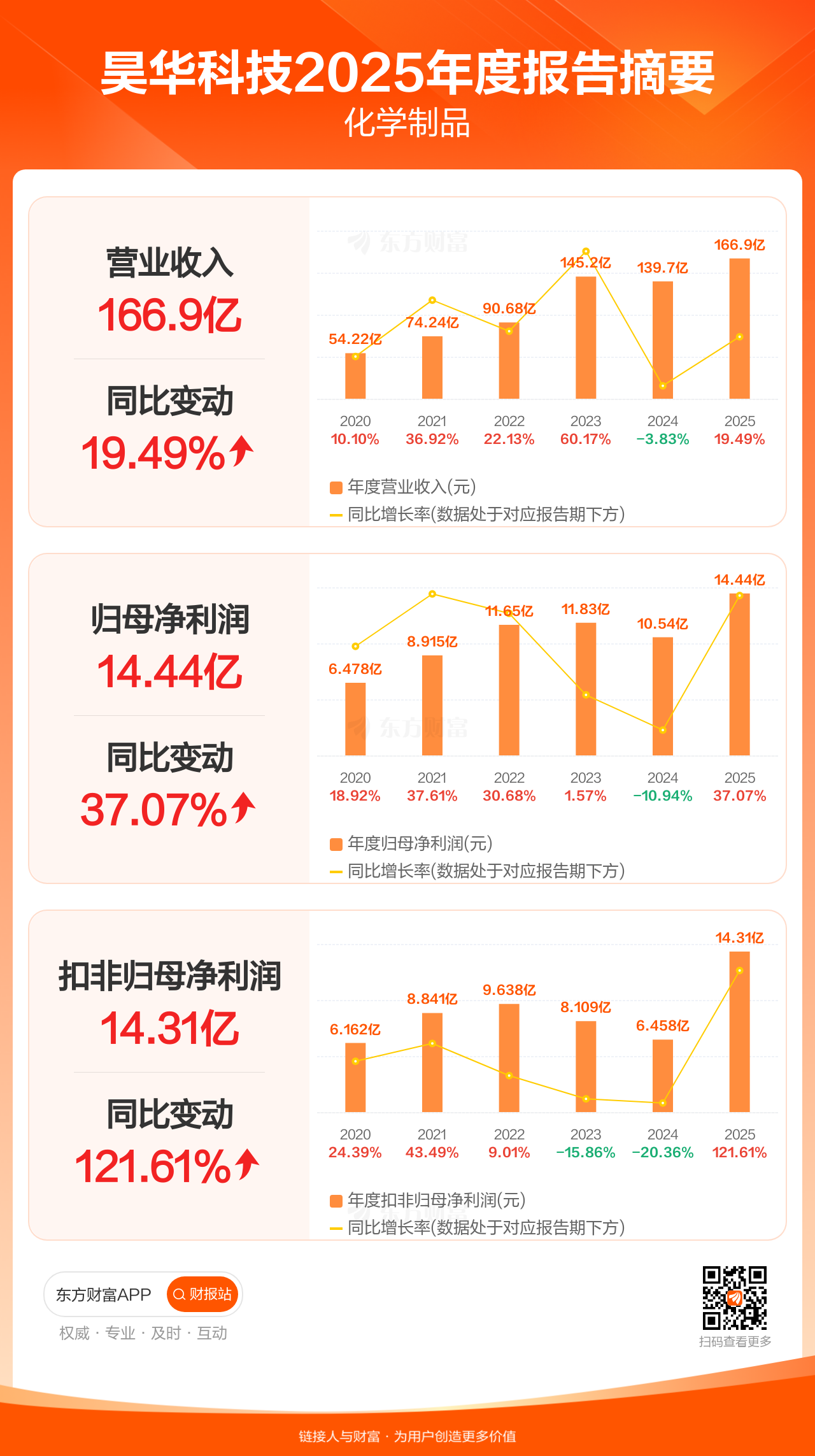 昊华科技4月24日发布2025年年报显示,公司全年实现营业收入166.89亿元,同比增长19.49%;归母净利润14.44亿元,同比增长37.07%;扣非归母净利润14.31亿元,同比增长121.61%。