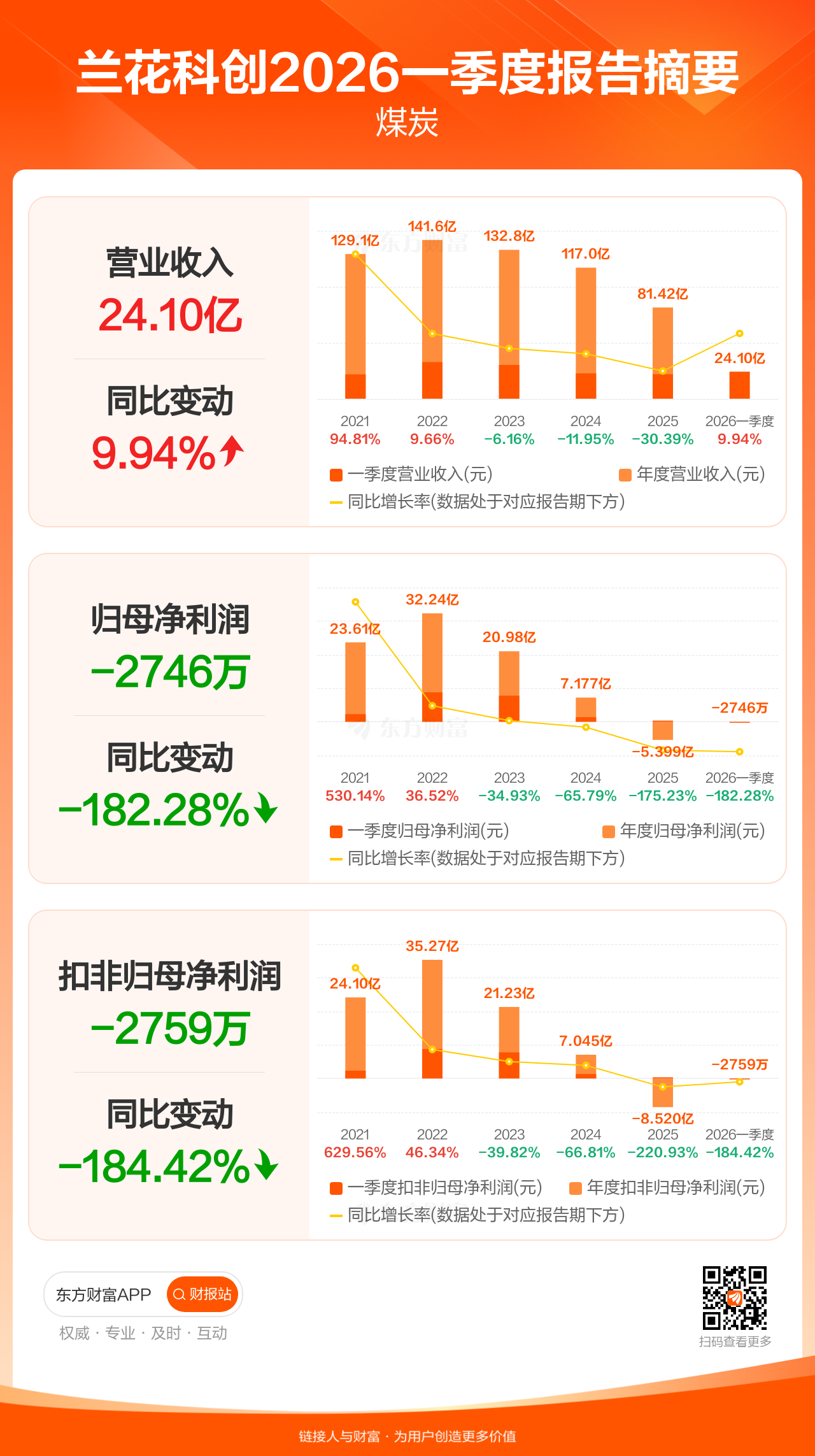 兰花科创4月24日发布2026年一季报显示,公司一季度实现营业收入24.10亿元,同比增长9.94%;归母净利润-2745.92万元;扣非归母净利润-2758.60万元。