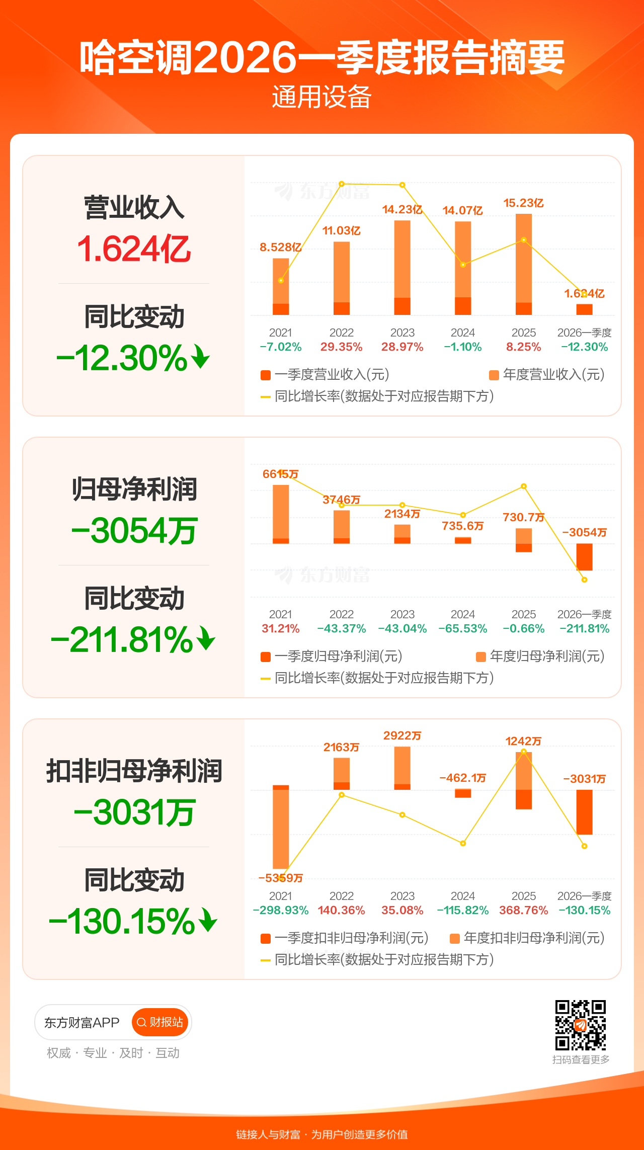 哈空调4月24日发布2026年一季报显示,公司一季度实现营业收入1.62亿元,同比下滑12.30%;归母净利润-3054.12万元;扣非归母净利润-3030.68万元。