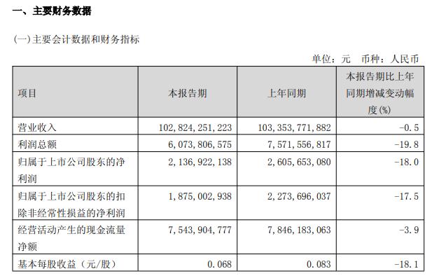 中国联通一季度营业收入为1028.24亿元,同比下降0.5%;归属于上市公司股东的净利润21.37亿元,同比下降18%。