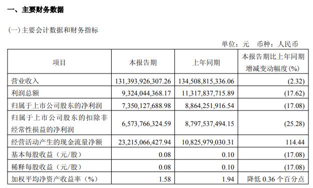 中国电信一季度营业收入为1313.94亿元,同比下降2.32%;归属于上市公司股东的净利润73.5亿元,同比下降17.08%。