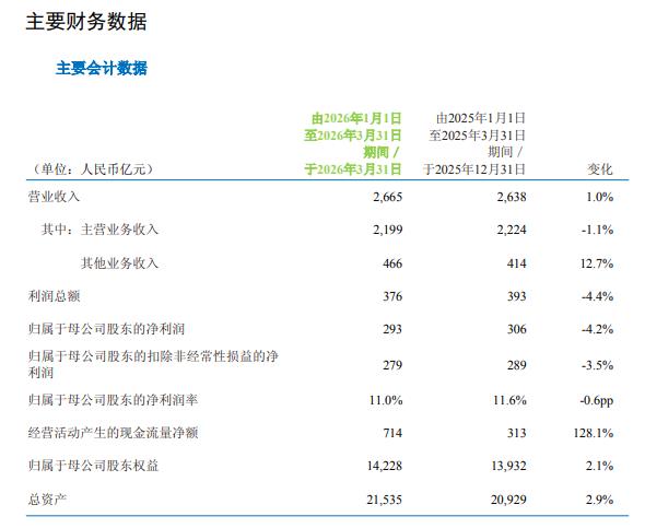 具体来看,中国移动一季度营业收入为2665亿元,同比增长1.0%;归属于母公司股东的净利润293亿元,同比下降4.2%。