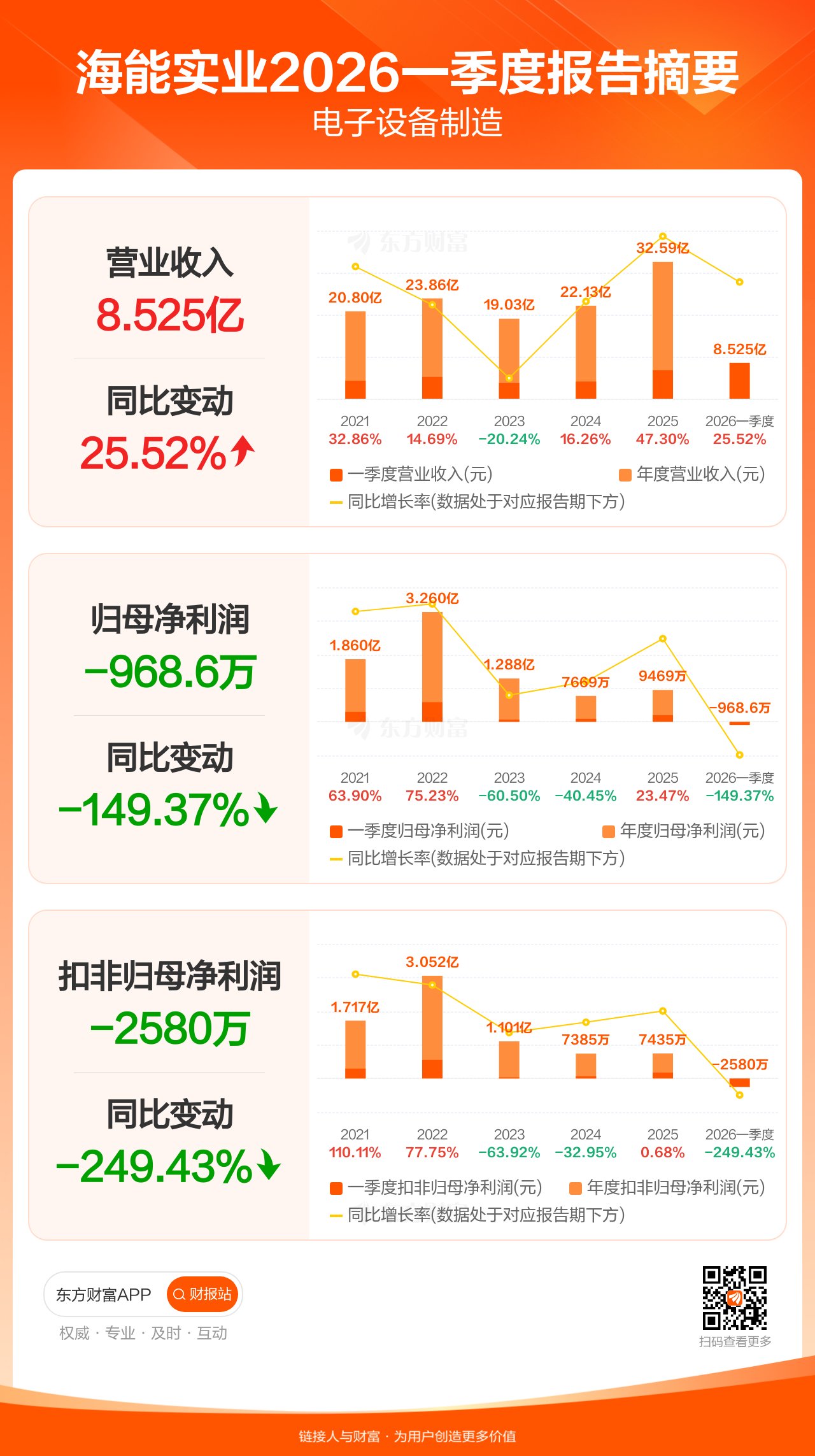 海能实业4月24日发布2026年一季报显示,公司一季度实现营业收入8.52亿元,同比增长25.52%;归母净利润-968.57万元;扣非归母净利润-2579.83万元。