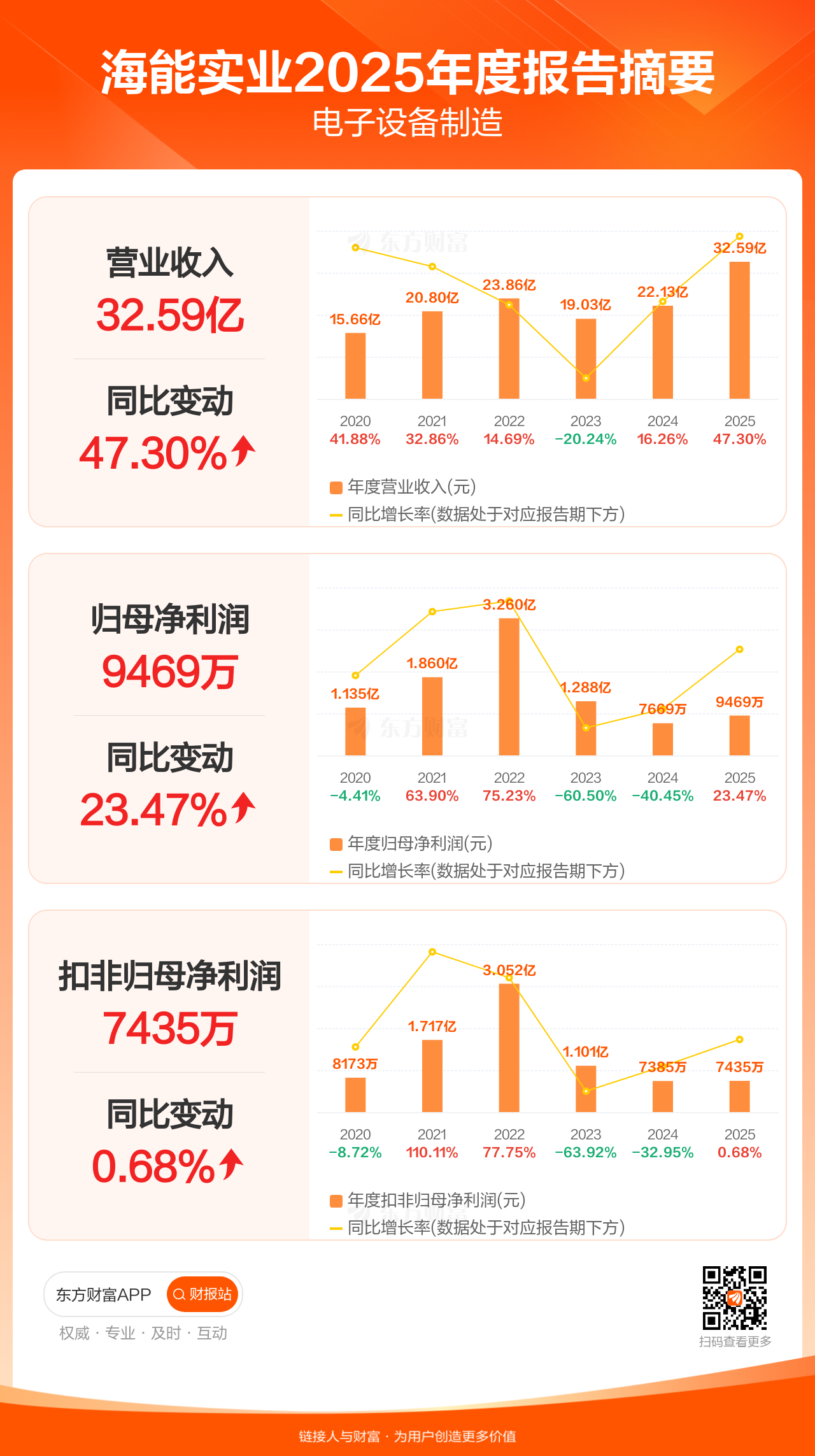 海能实业4月24日发布2025年年报显示,公司全年实现营业收入32.59亿元,同比增长47.30%;归母净利润9469.10万元,同比增长23.47%;扣非归母净利润7435.39万元,同比增长0.68%。