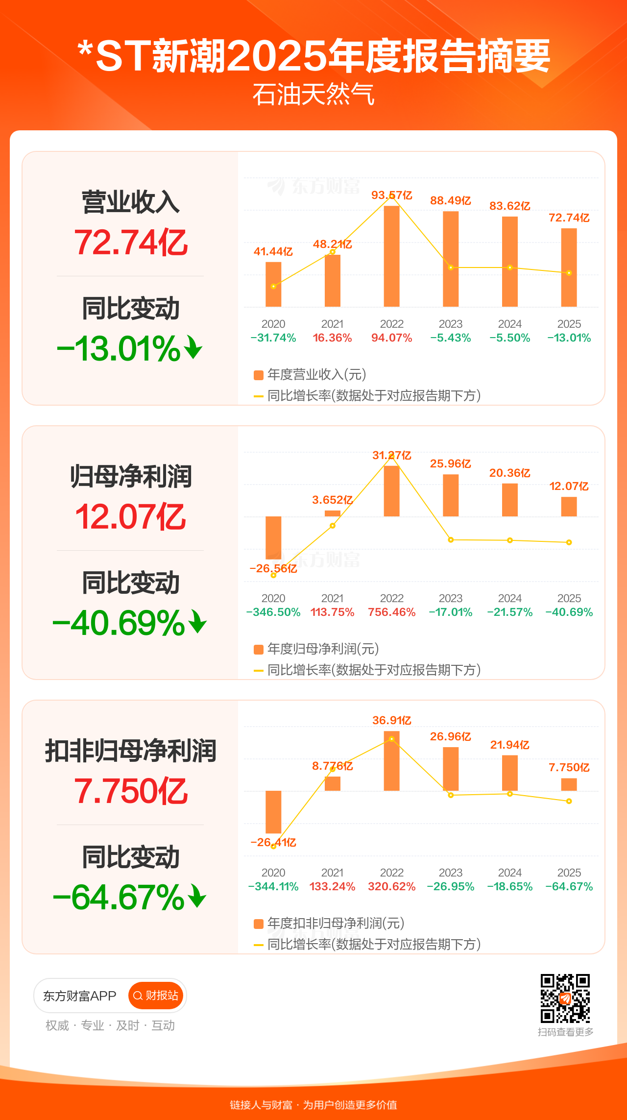 *ST新潮4月24日发布2025年年报显示,公司全年实现营业收入72.74亿元,同比下滑13.01%;归母净利润12.07亿元,同比下滑40.69%;扣非归母净利润7.75亿元,同比下滑64.67%。
