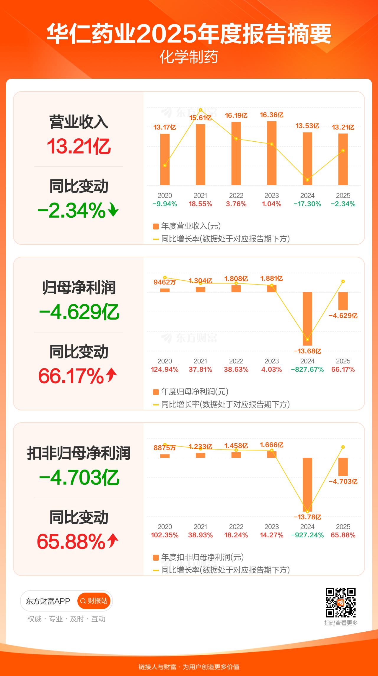 华仁药业4月24日发布2025年年报显示,公司全年实现营业收入13.21亿元,同比下滑2.34%;归母净利润-4.63亿元;扣非归母净利润-4.70亿元。