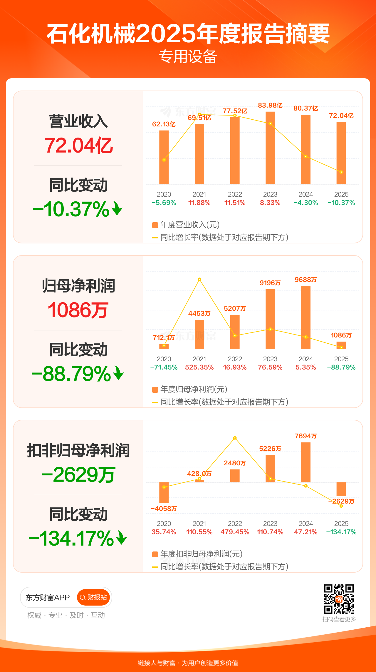 石化机械4月24日发布2025年年报显示,公司全年实现营业收入72.04亿元,同比下滑10.37%;归母净利润1085.82万元,同比下滑88.79%;扣非归母净利润-2628.69万元。