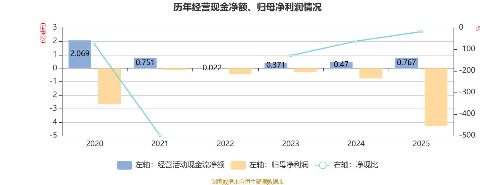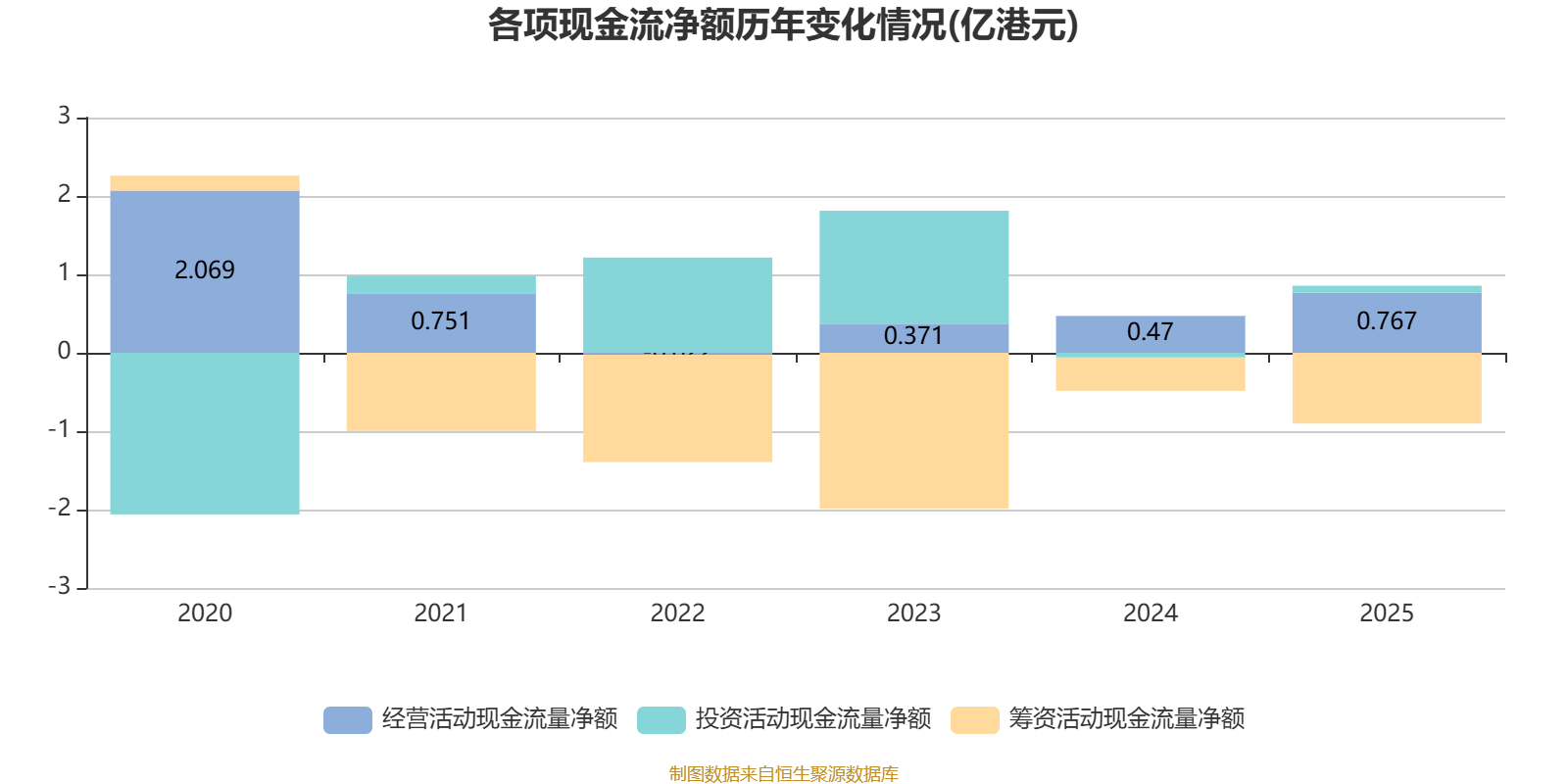 2025年,公司经营活动现金流净额为7667.6万港元,同比增长62.98%;筹资活动现金流净额-9016.3万港元,同比减少4764.2万港元;投资活动现金流净额882.2万港元,上年同期为-601.5万港元。