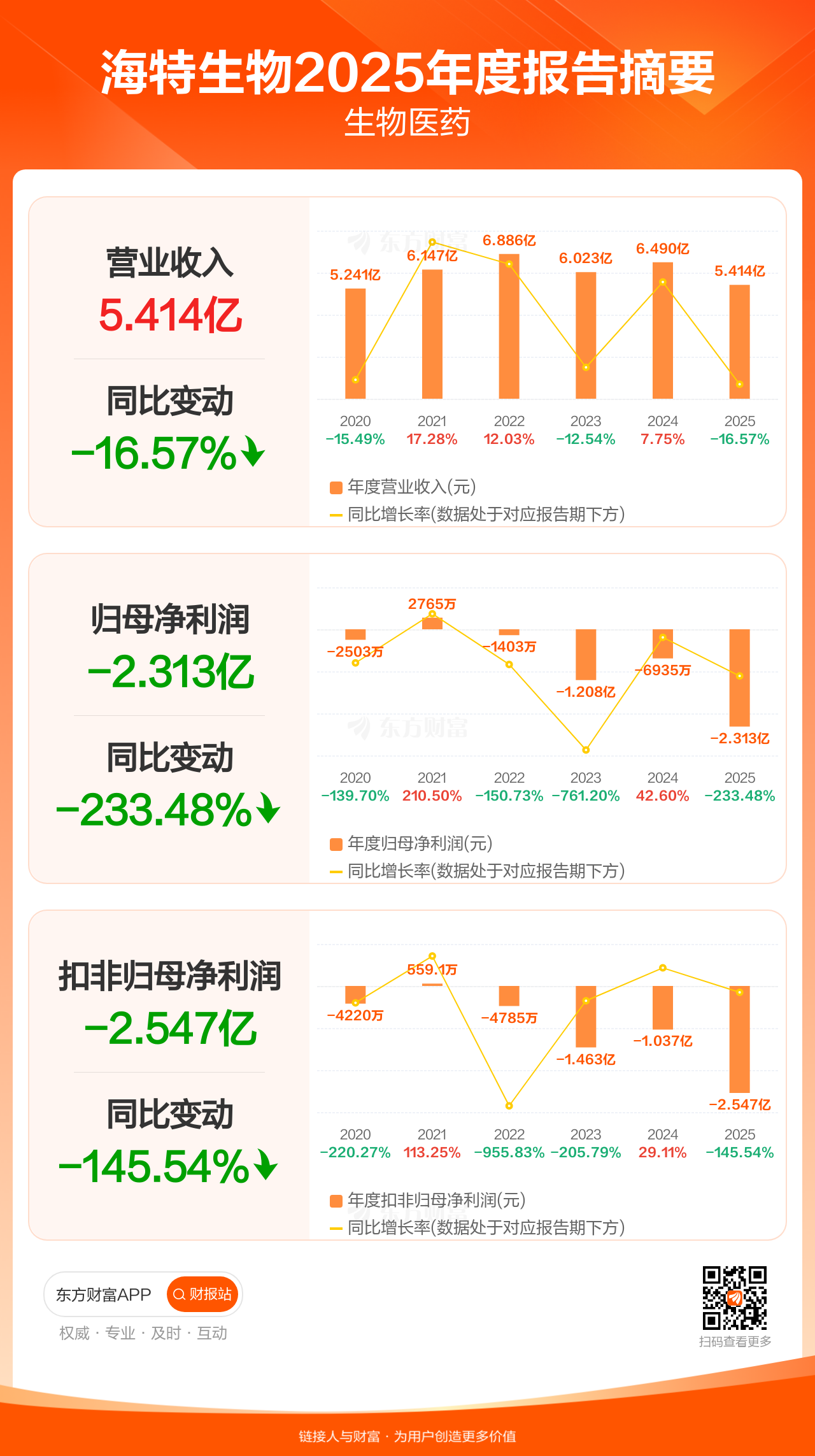 海特生物4月24日发布2025年年报显示,公司全年实现营业收入5.41亿元,同比下滑16.57%;归母净利润-2.31亿元;扣非归母净利润-2.55亿元。