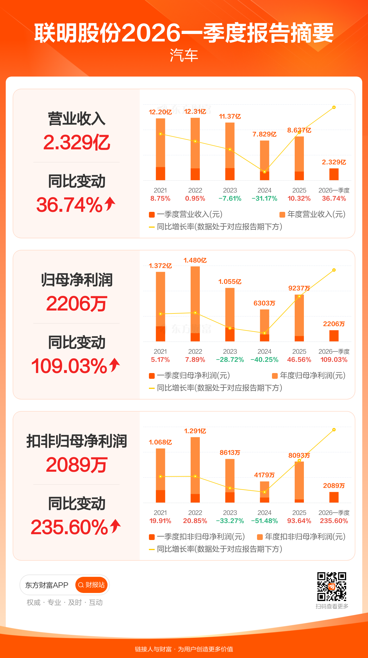 联明股份4月24日发布2026年一季报显示,公司一季度实现营业收入2.33亿元,同比增长36.74%;归母净利润2206.32万元,同比增长109.03%;扣非归母净利润2088.83万元,同比增长235.60%。