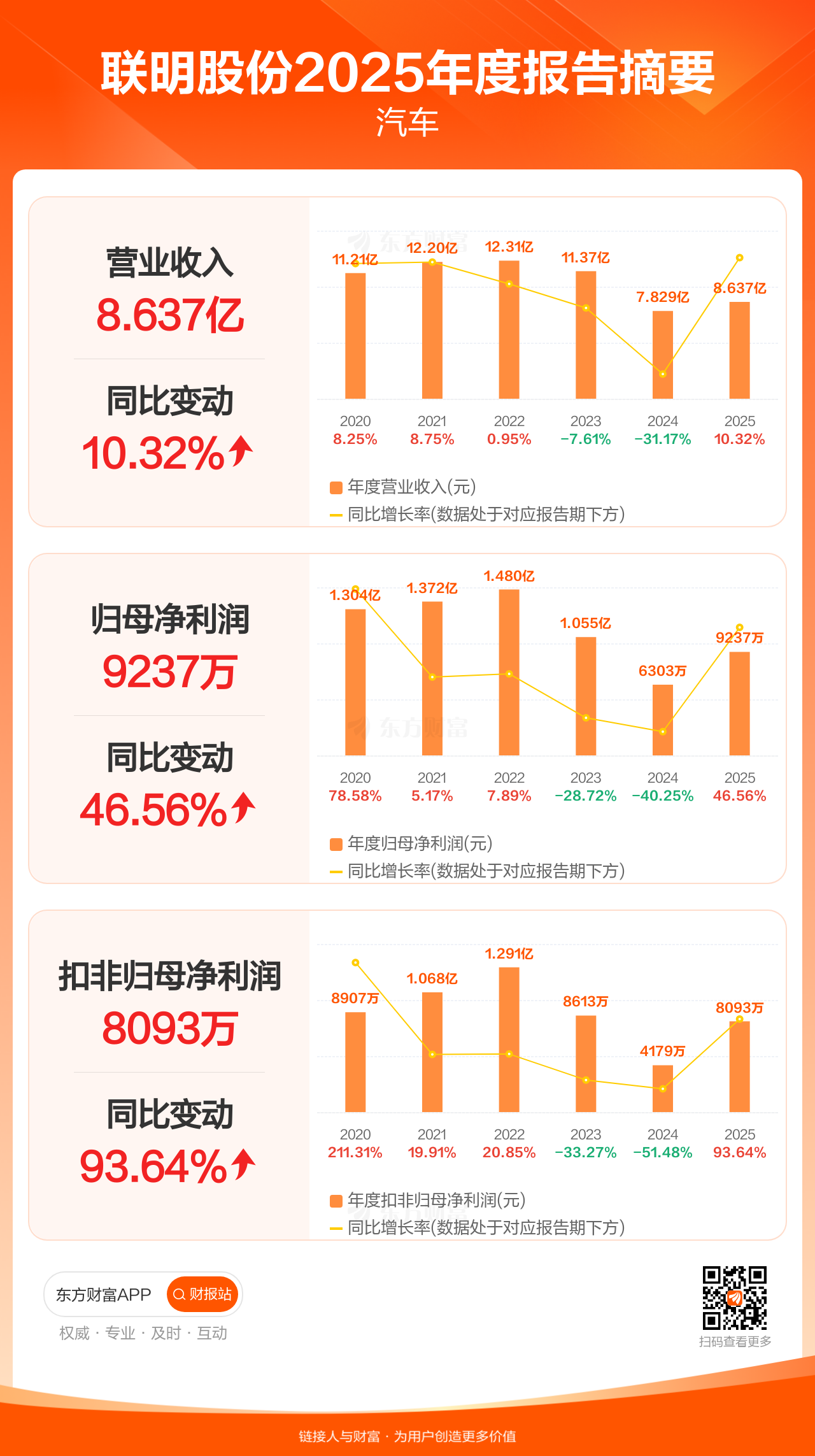 联明股份4月24日发布2025年年报显示,公司全年实现营业收入8.64亿元,同比增长10.32%;归母净利润9237.32万元,同比增长46.56%;扣非归母净利润8092.88万元,同比增长93.64%。