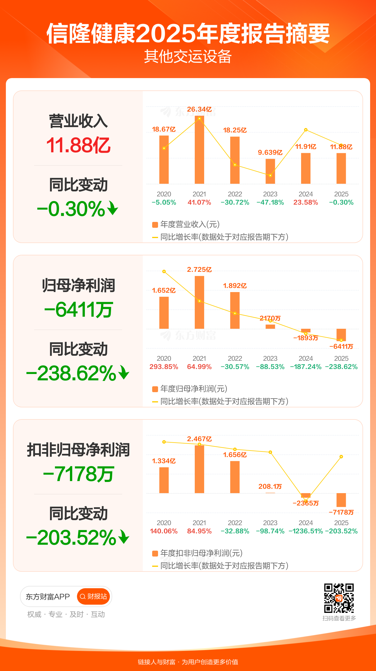 信隆健康4月24日发布2025年年报显示,公司全年实现营业收入11.88亿元,同比下滑0.30%;归母净利润-6411.47万元;扣非归母净利润-7178.02万元。