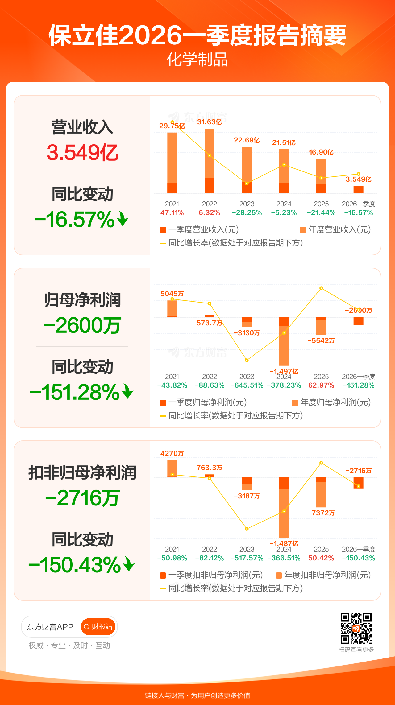 保立佳4月24日发布2026年一季报显示,公司一季度实现营业收入3.55亿元,同比下滑16.57%;归母净利润-2600.10万元;扣非归母净利润-2716.48万元。