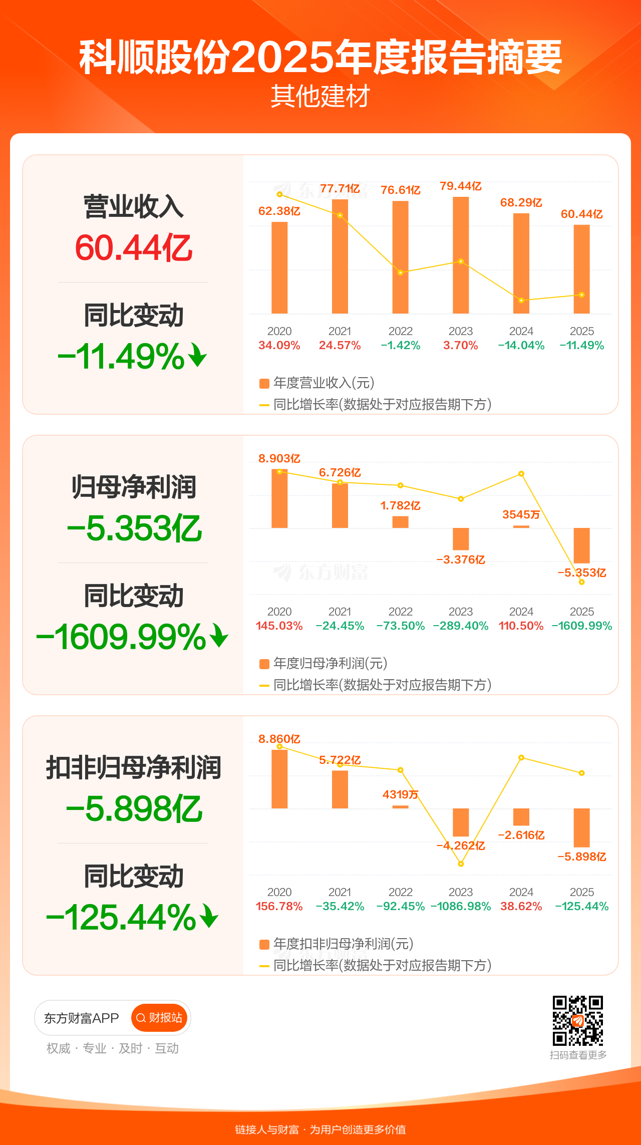 科顺股份4月24日发布2025年年报显示,公司全年实现营业收入60.44亿元,同比下滑11.49%;归母净利润-5.35亿元;扣非归母净利润-5.90亿元。