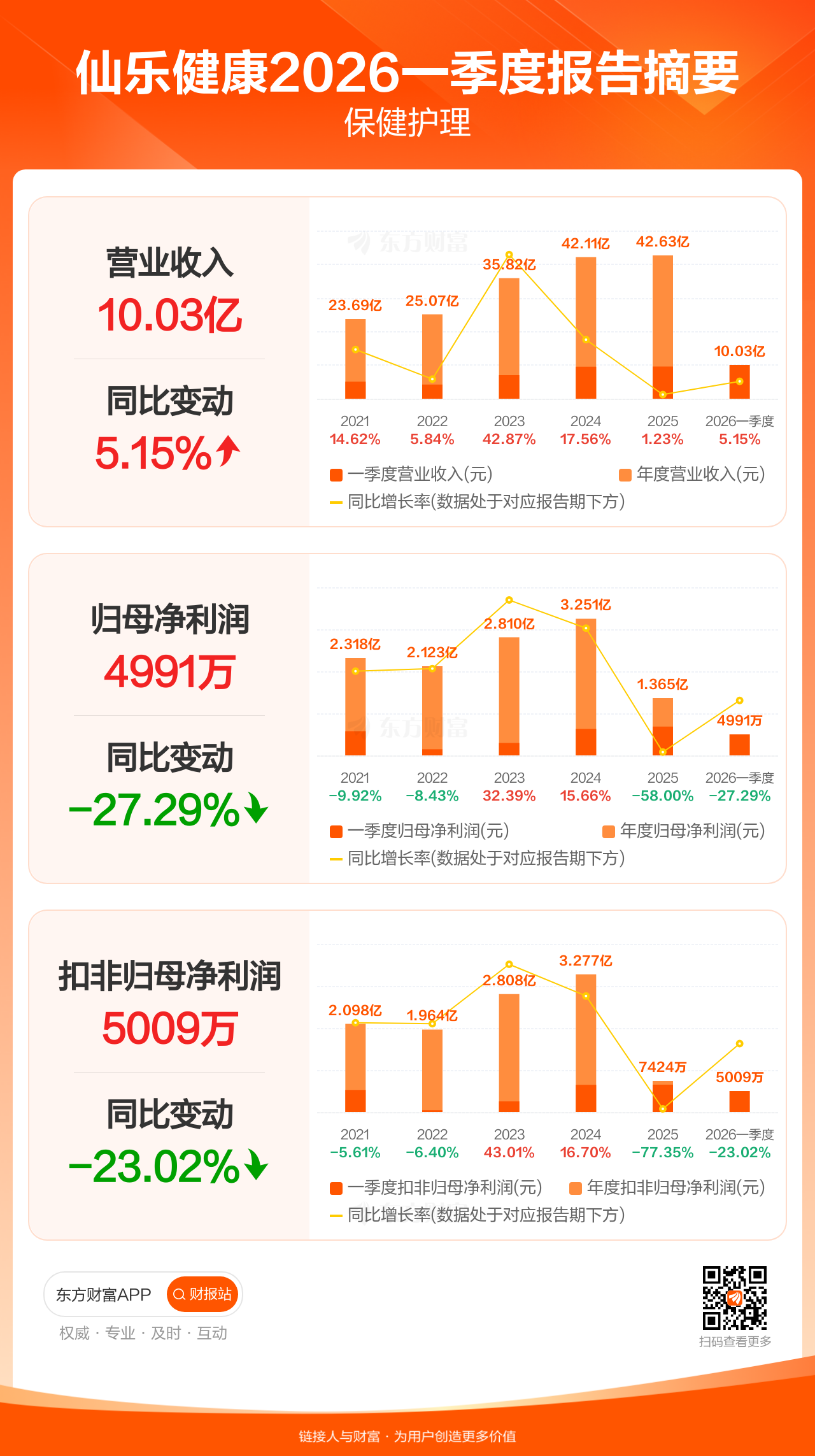 仙乐健康4月24日发布2026年一季报显示,公司一季度实现营业收入10.03亿元,同比增长5.15%;归母净利润4990.56万元,同比下滑27.29%;扣非归母净利润5008.63万元,同比下滑23.02%。