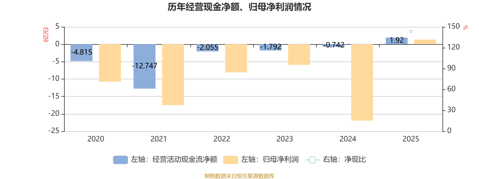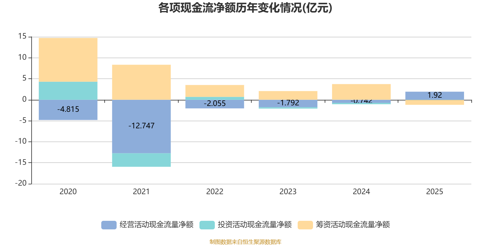 2025年,公司经营活动现金流净额为1.92亿元,同比增加2.66亿元;筹资活动现金流净额-1.15亿元,同比减少4.88亿元;投资活动现金流净额-592万元,上年同期为-3191.2万元。