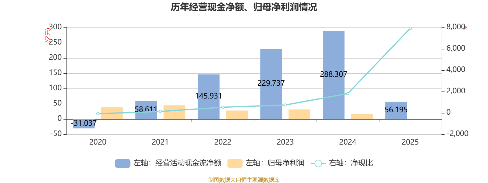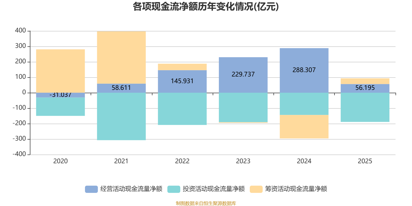 2025年,公司经营活动现金流净额为56.19亿元,同比下降80.51%;筹资活动现金流净额36.78亿元,同比增加188.45亿元;投资活动现金流净额-189.11亿元,上年同期为-144.18亿元。