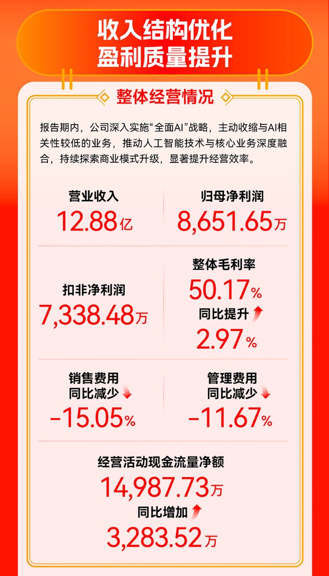 2025年,面对行业环境变化,值得买科技持续推进业务结构优化,主动收缩与AI相关性较低的业务,进一步聚焦AI驱动的高价值领域和高质量业务。报告期内,公司整体毛利率提升至50.17%,较上年同期提升2.97个百分点,销售费用与管理费用分别同比减少15.05%、11.67%;同时实现AI相关收入8716.60万元,经营质量持续改善。