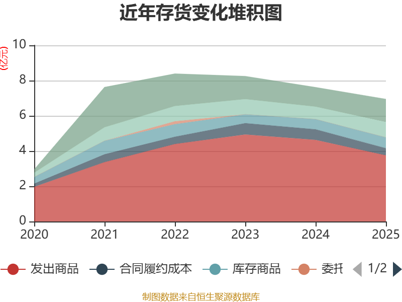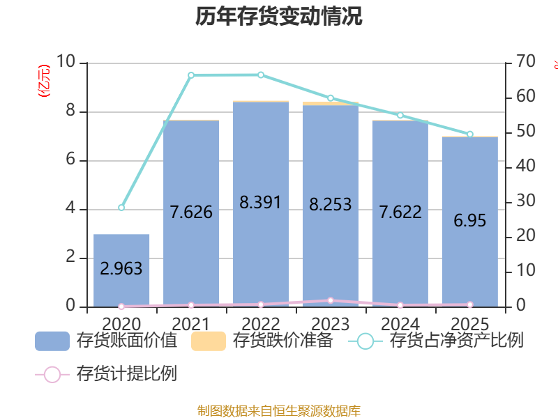 从存货变动来看,截至2025年末,公司存货账面价值为6.95亿元,占净资产的49.47%,较上年末减少6718.97万元。其中,存货跌价准备为388.42万元,计提比例为0.56%。