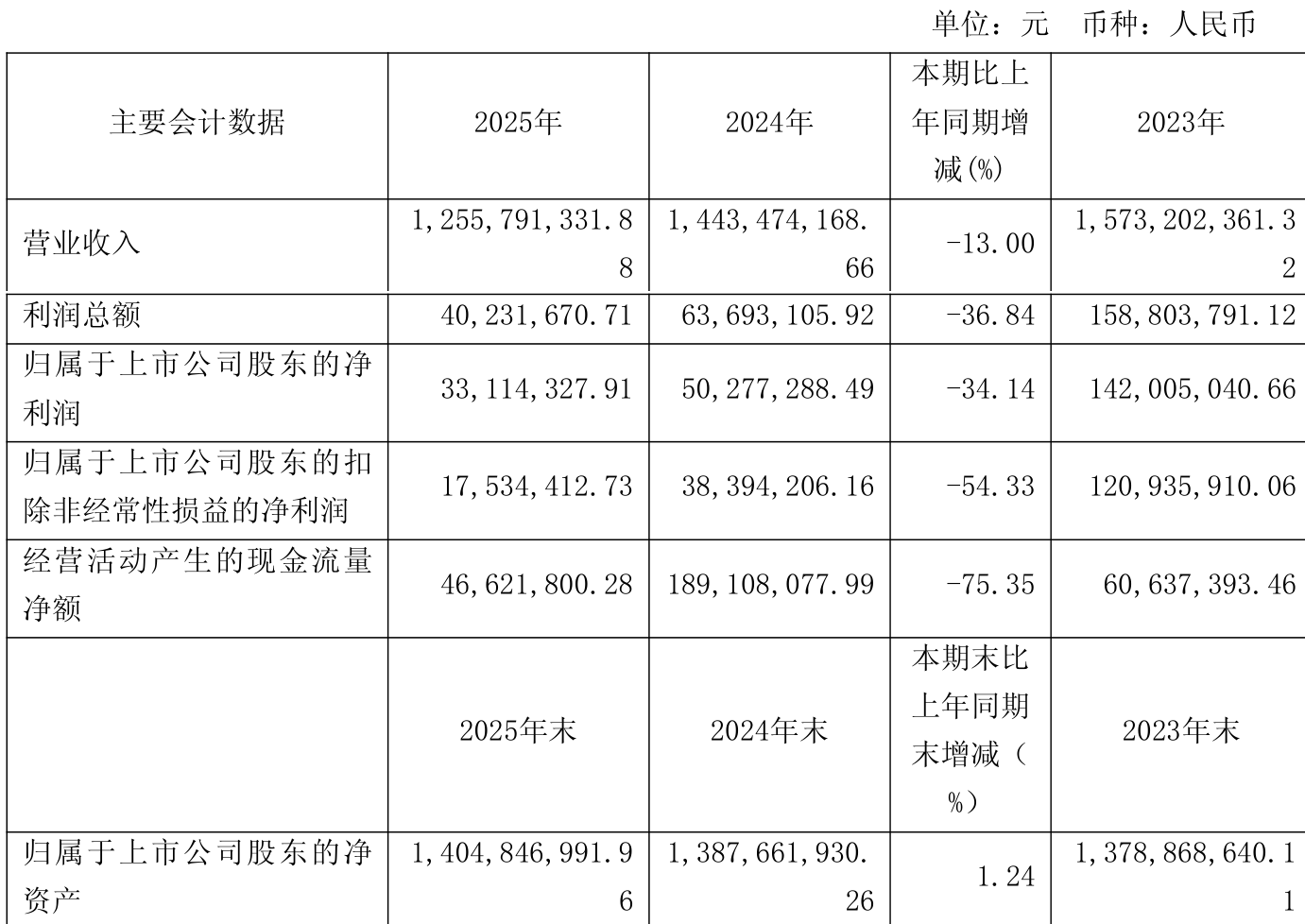 中证智能财讯音飞储存(603066)4月24日披露2025年年度报告。2025年,公司实现营业总收入12.56亿元,同比下降13.00%;归母净利润3311.43万元,同比下降34.14%;扣非净利润1753.44万元,同比下降54.33%;经营活动产生的现金流量净额为4662.18万元,同比下降75.35%;报告期内,音飞储存基本每股收益为0.11元,加权平均净资产收益率为2.37%。公司2025年度分配预案为:拟向全体股东每10股派现0.34元(含税)。