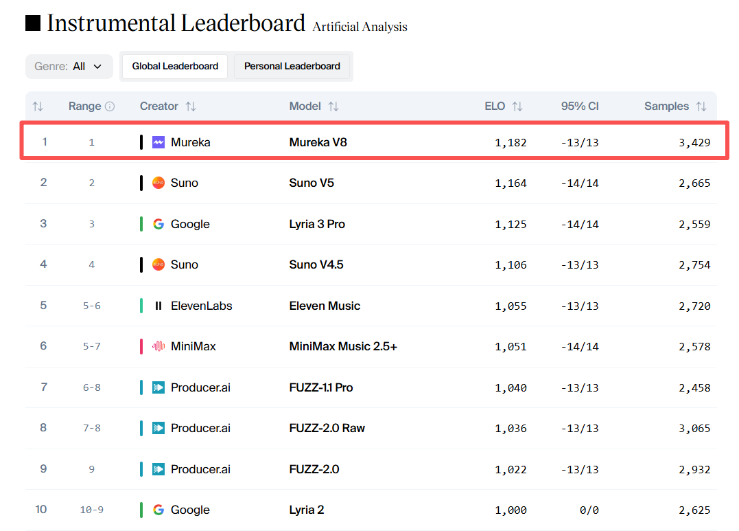 Mureka V8在Artificial Analysis Instrumental(乐器)中的排名表现