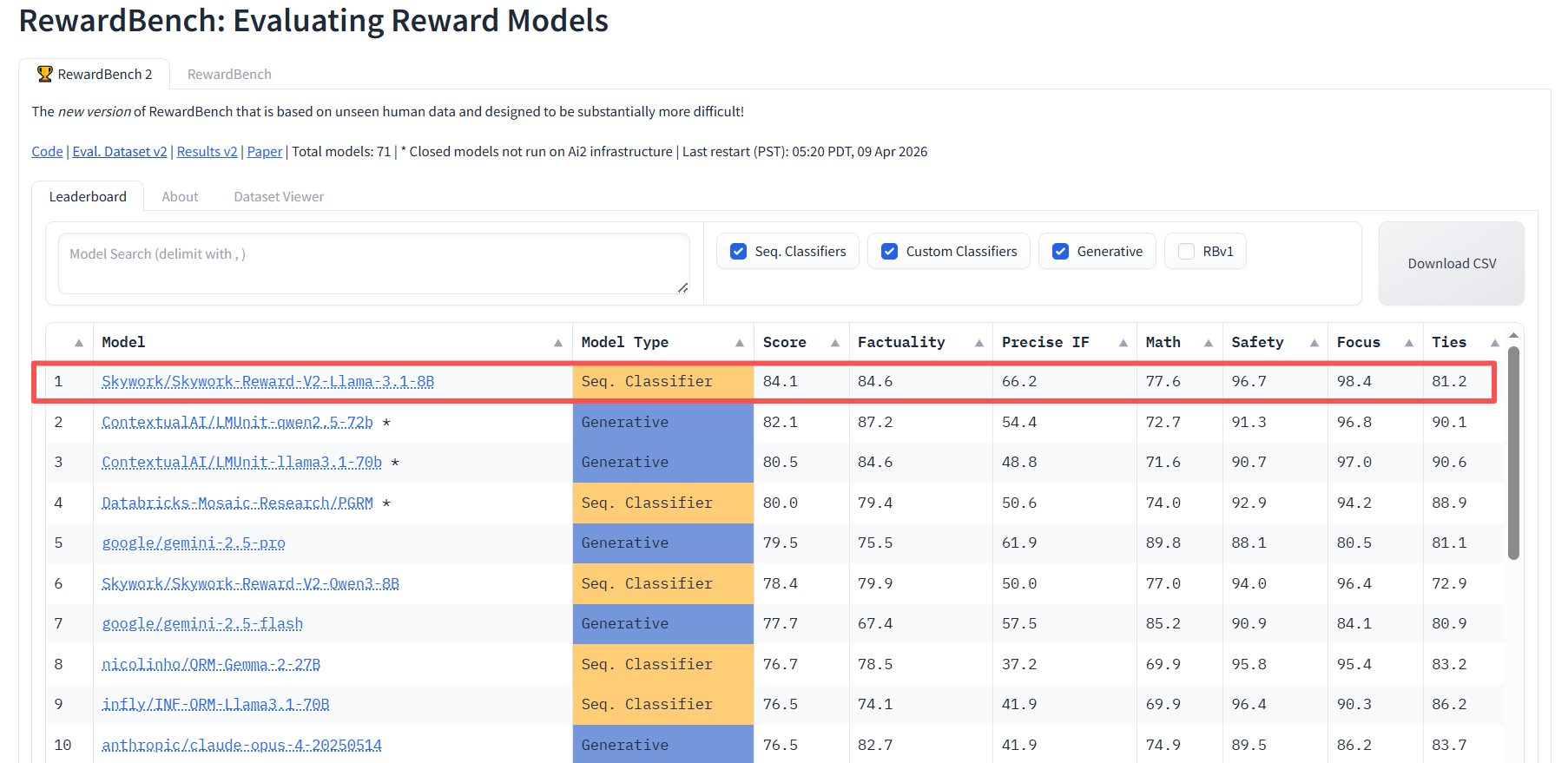 Reward Model系列在RewardBench榜单排名