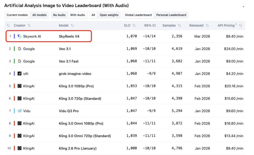 视频模型方向,SkyReels-V4在Artificial Analysis的多项评测中登顶全球第一,超越Google Veo 3.1、Sora 2、Kling 3.0等国际领先模型。