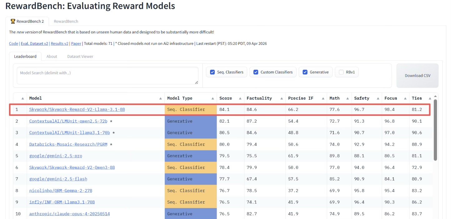 基座文本与多模态方向,Skywork系列模型在数学推理、代码生成及多模态领域持续突破,多项评测成绩跻身第一梯队。公司于2025年7月发布Skywork-Reward-V2系列奖励模型。自发布以来,Reward Model系列在全球最权威奖励模型榜单RewardBench上长期位居榜首。2025年11月,公司推出Skywork R1V4模型,在8项多模态理解基准评测中整体优于Gemini 2.5 Flash,并在其中5项任务上实现对Gemini 2.5 Pro的超越,综合竞争力突出。