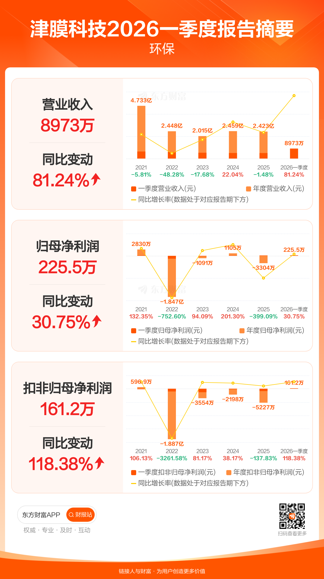 津膜科技4月24日发布2026年一季报显示,公司一季度实现营业收入8972.62万元,同比增长81.24%;归母净利润225.47万元,同比增长30.75%;扣非归母净利润161.21万元,同比增长118.38%。