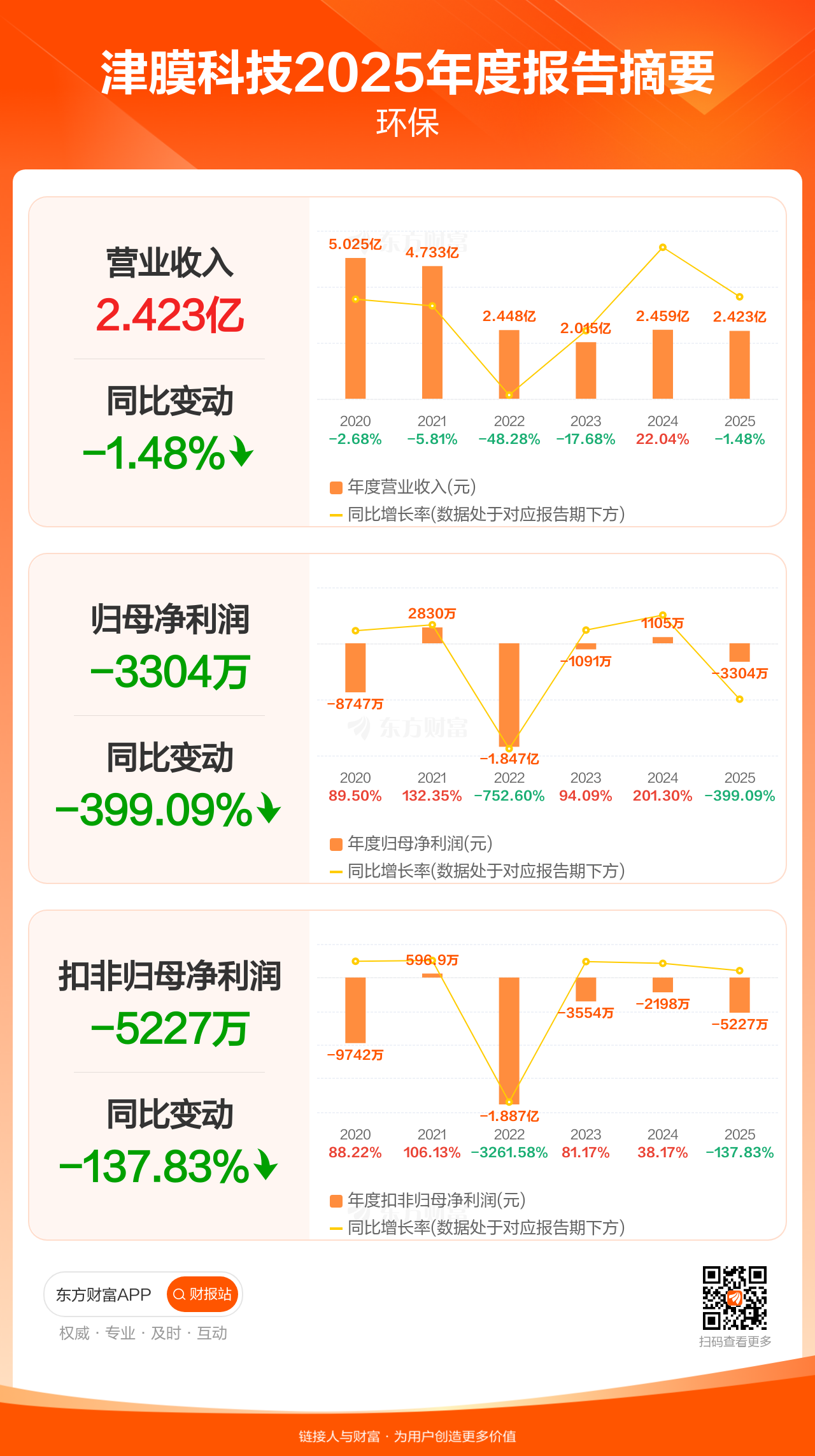 津膜科技4月24日发布2025年年报显示,公司全年实现营业收入2.42亿元,同比下滑1.48%;归母净利润-3304.13万元;扣非归母净利润-5226.54万元。