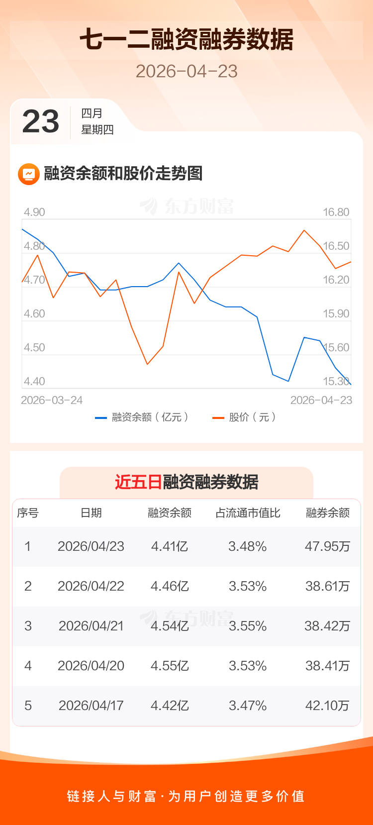 交易所最新数据显示,七一二于2026年4月23日获融资买入871.16万元,融资偿还1304.64万元,当日融资净偿还433.48万元。目前,该股融资余额4.41亿,占流通市值比例为3.48%。