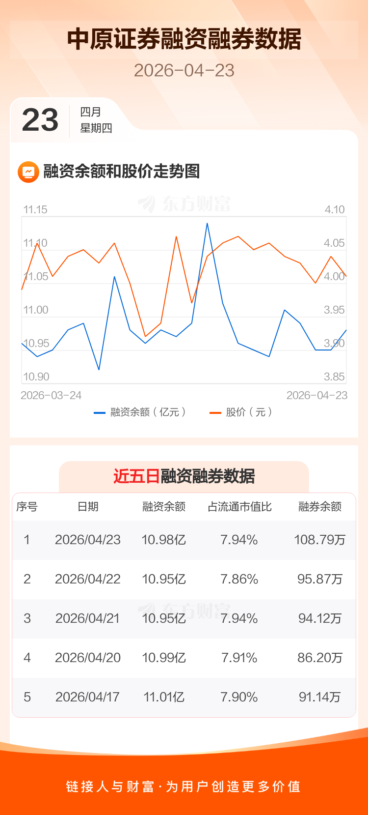 交易所最新数据显示,中原证券于2026年4月23日获融资买入1620.42万元,融资偿还1329.39万元,当日融资净买入291.03万元。目前,该股融资余额10.98亿,占流通市值比例为7.94%。