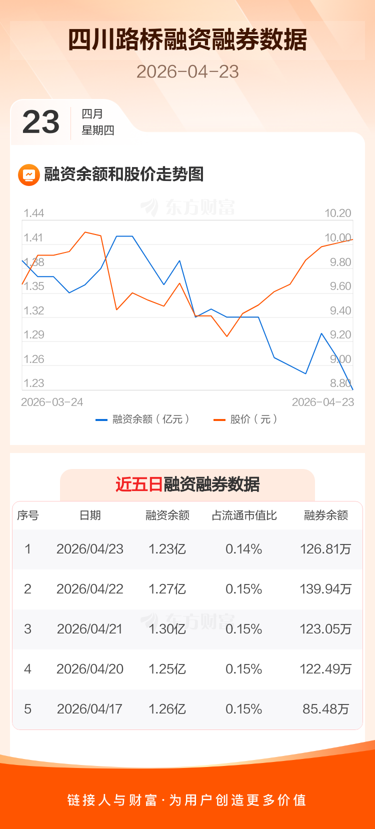 交易所最新数据显示,四川路桥于2026年4月23日获融资买入423.24万元,融资偿还829.24万元,当日融资净偿还406万元。目前,该股融资余额1.23亿,占流通市值比例为0.14%。