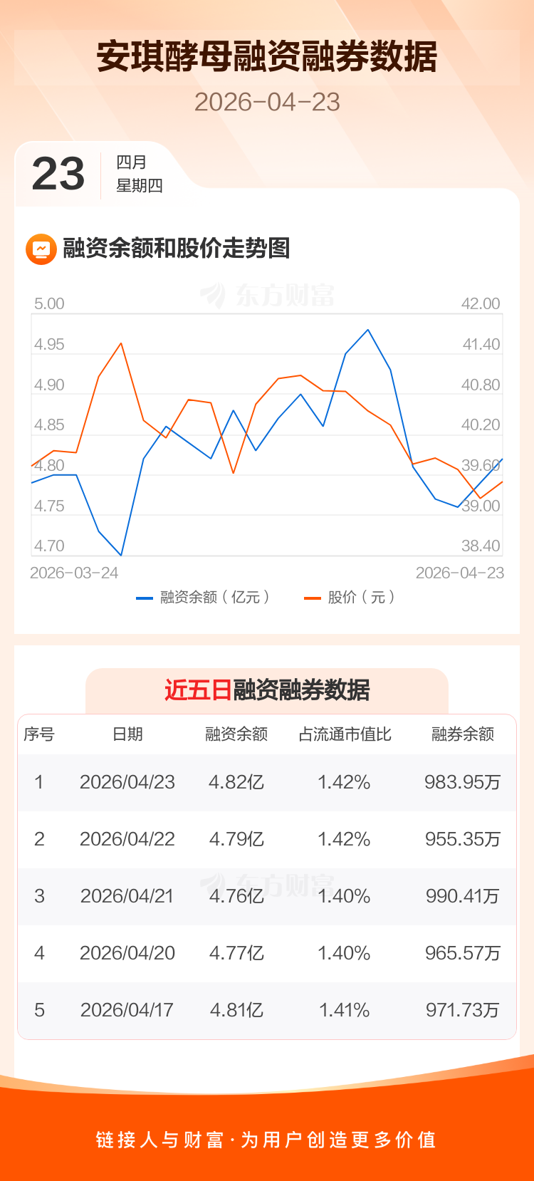 交易所最新数据显示,安琪酵母于2026年4月23日获融资买入1366.13万元,融资偿还1048.60万元,当日融资净买入317.53万元。目前,该股融资余额4.82亿,占流通市值比例为1.42%。