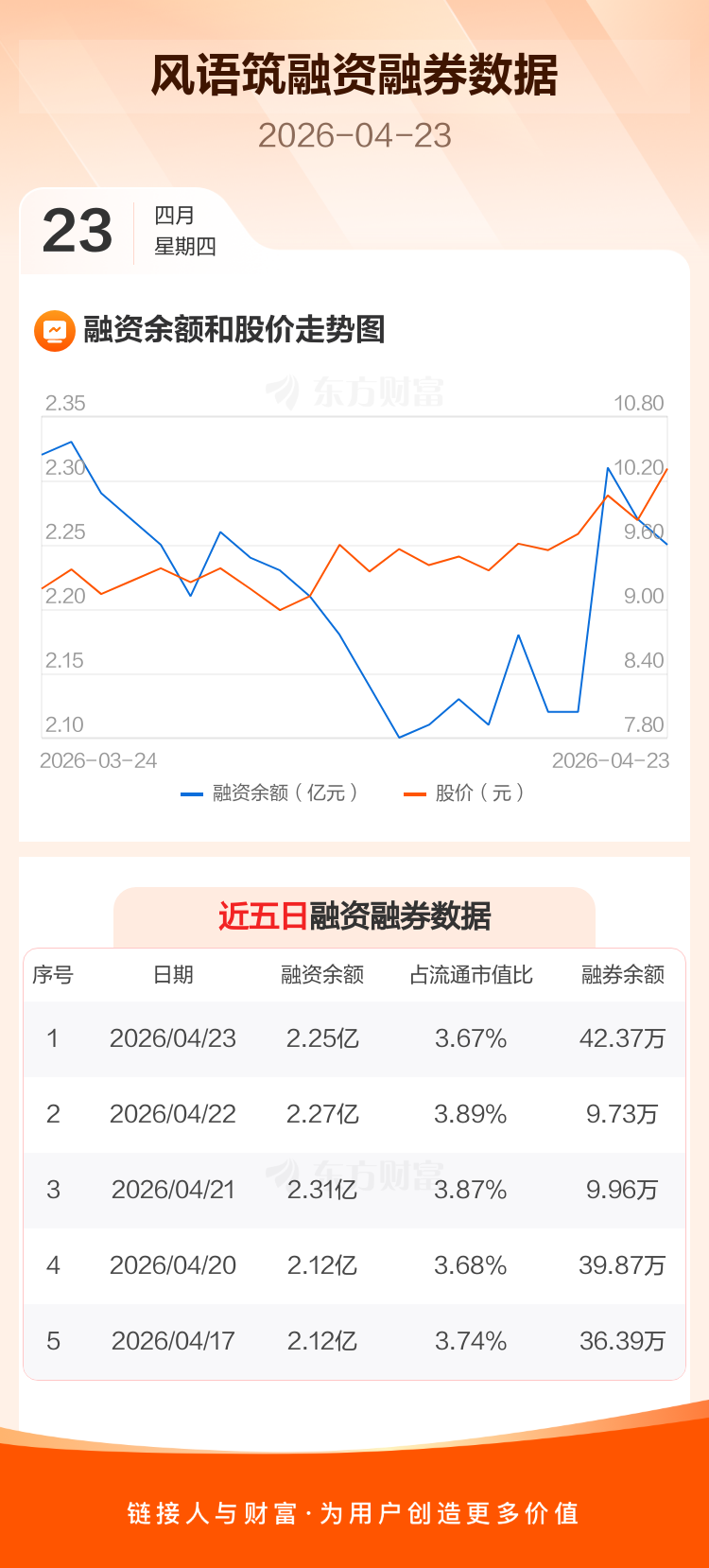 交易所最新数据显示,风语筑于2026年4月23日获融资买入6112.28万元,融资偿还6342.59万元,当日融资净偿还230.31万元。目前,该股融资余额2.25亿,占流通市值比例为3.67%。