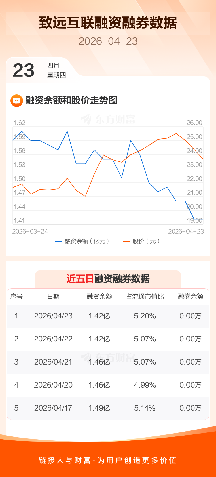 交易所最新数据显示,致远互联于2026年4月23日获融资买入920.67万元,融资偿还981.81万元,当日融资净偿还61.14万元。目前,该股融资余额1.42亿,占流通市值比例为5.20%。