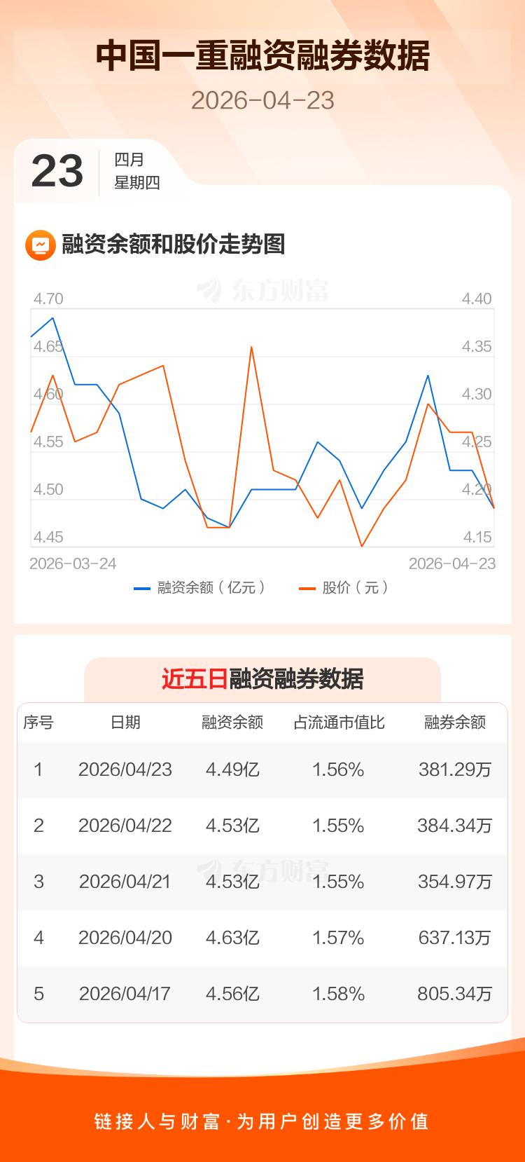 交易所最新数据显示,中国一重于2026年4月23日获融资买入1746.53万元,融资偿还2123.26万元,当日融资净偿还376.73万元。目前,该股融资余额4.49亿,占流通市值比例为1.56%。