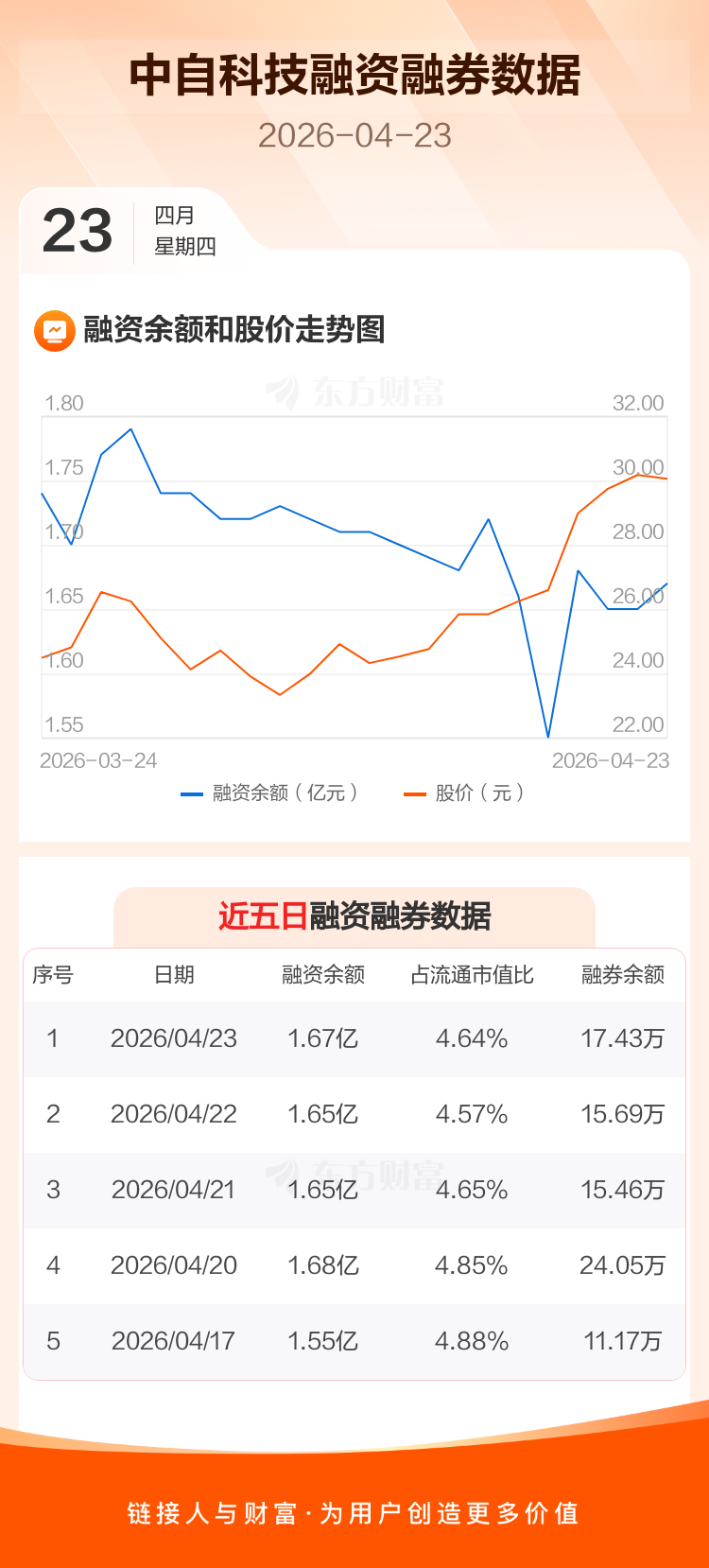 交易所最新数据显示,中自科技于2026年4月23日获融资买入1174.35万元,融资偿还981.46万元,当日融资净买入192.89万元。目前,该股融资余额1.67亿,占流通市值比例为4.64%。