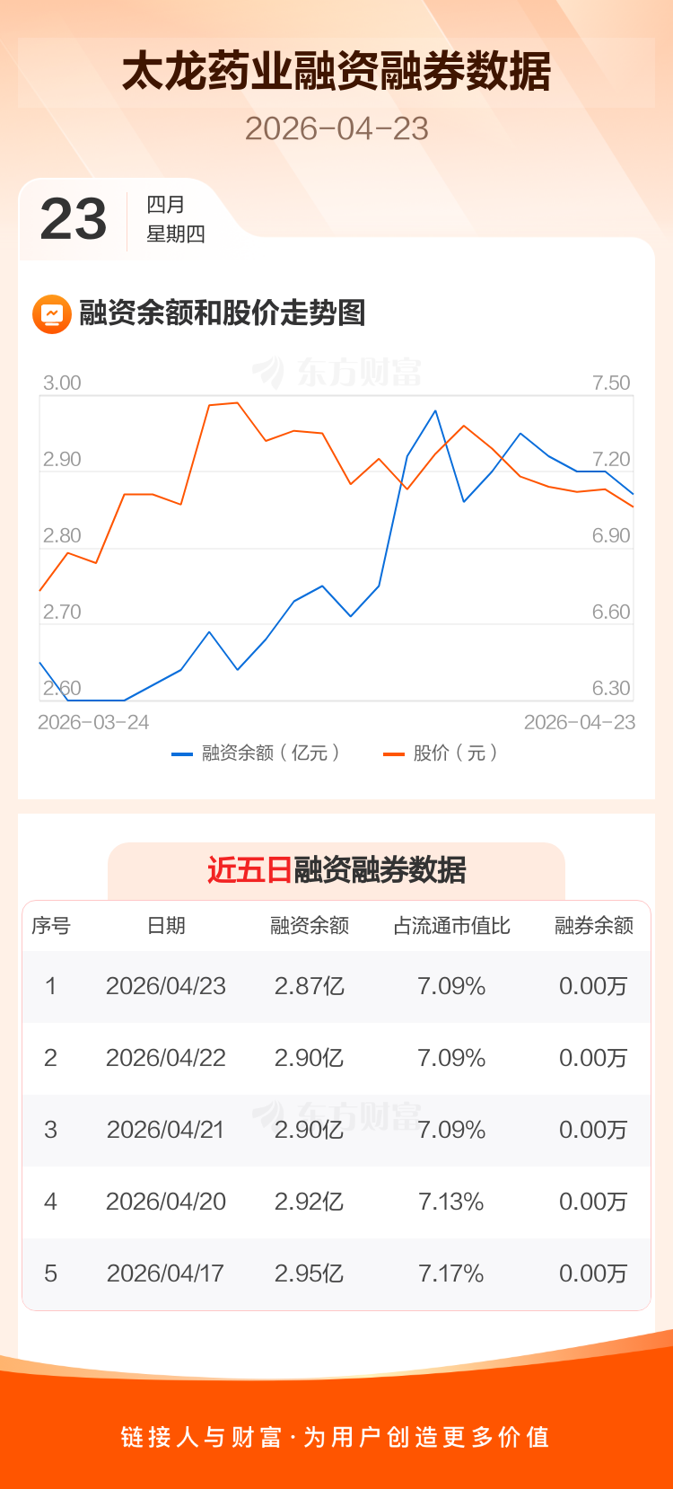 交易所最新数据显示,太龙药业于2026年4月23日获融资买入542.58万元,融资偿还836.79万元,当日融资净偿还294.21万元。目前,该股融资余额2.87亿,占流通市值比例为7.09%。