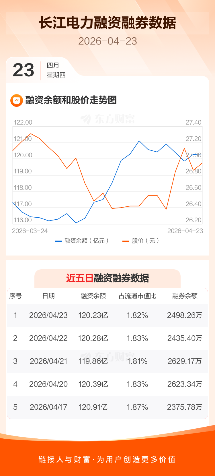 交易所最新数据显示,长江电力于2026年4月23日获融资买入1.31亿元,融资偿还1.36亿元,当日融资净偿还475.85万元。目前,该股融资余额120.23亿,占流通市值比例为1.82%。