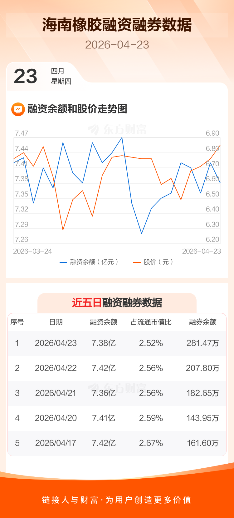 交易所最新数据显示,海南橡胶于2026年4月23日获融资买入3829.61万元,融资偿还4179.75万元,当日融资净偿还350.14万元。目前,该股融资余额7.38亿,占流通市值比例为2.52%。